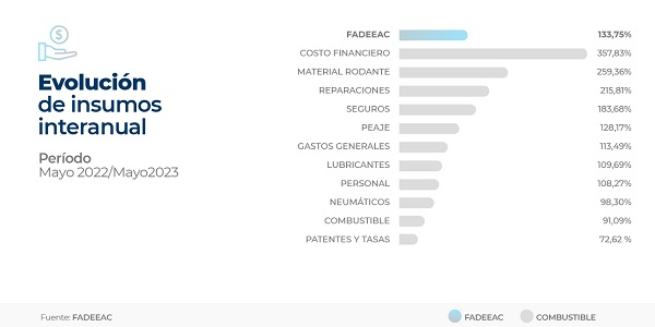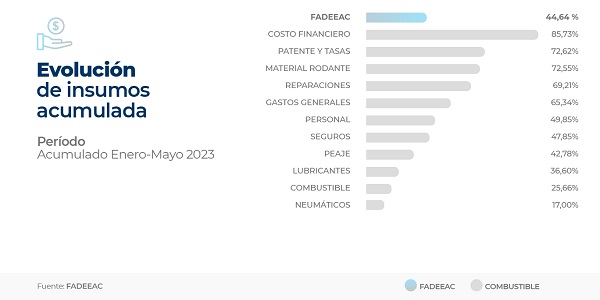 Com esse resultado, somente nos primeiros cinco meses de 2023, o aumento acumulado sobe para 44,6% segundo o Índice de Custos de Transporte (ICT) da Federação Argentina de Entidades Empresariais do Transporte Rodoviário de Cargas (FADEEAC). A alta importante em maio ocorre após a alta de abril (7,75%), depois que as situações de estresse cambial produzidas impactaram negativamente os diversos preços e custos da economia.