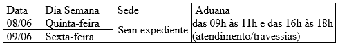 As Alfândegas da Receita Federal do Brasil em Uruguaiana e Foz do Iguaçu encaminharam seus respectivos comunicados a respeito dos horários de expediente no feriado de Corpus Christi, da próxima quinta-feira, 08 de junho. Ainda, destaca-se que o dia 09 de junho (sexta-feira) foi dado como ponto facultativo, desta forma, as importações que não forem parametrizadas até quarta-feira só serão liberadas na próxima segunda-feira (12/06).