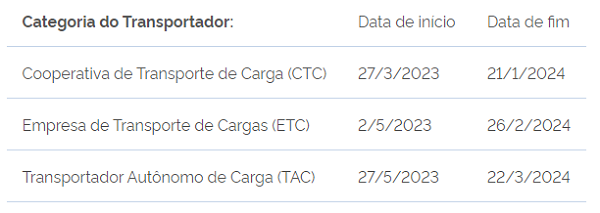 O cronograma para a categoria TAC - Transportador Autônomo de Carga permanece inalterado.