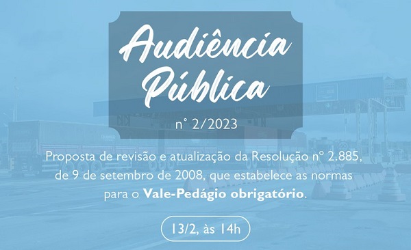 A Agência Nacional de Transportes Terrestres (ANTT) publicou a Deliberação nº 3 que comunica a realização da Audiência Pública nº 2/2023 sobre a proposta de revisão e atualização da Resolução nº 2.885, de 9 de setembro de 2008, que estabelece as normas para o Vale-Pedágio obrigatório e institui os procedimentos de habilitação de empresas fornecedoras em âmbito nacional, aprovação de modelos e sistemas operacionais, as infrações e suas respectivas penalidades.