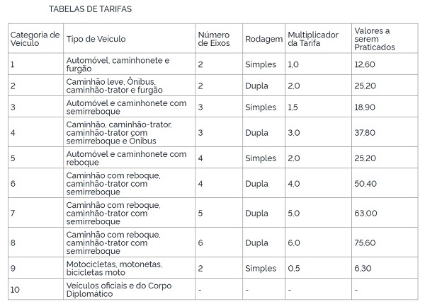 Reajuste: tem por intuito a correção monetária dos valores da tarifa e leva em consideração a variação do Índice de Preços ao Consumidor Amplo (IPCA). Acontece uma vez ao ano, sempre no aniversário do início da cobrança de pedágio.