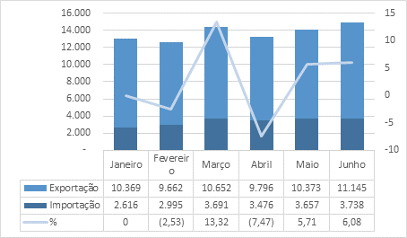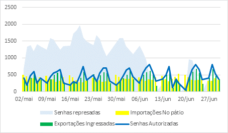 No levantamento feito pela Associação, é possível observar a variação dos períodos e a situação da importação, exportação e senhas represadas. Confira: