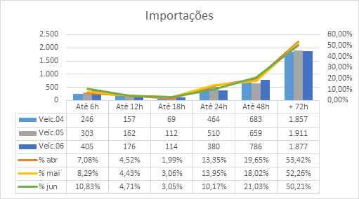 Ainda, um dado interessante para se analisar também é o tempo médio de permanência dentro do recinto. Tanto na importação quanto na exportação houve aumento do fluxo nos últimos três meses comparados, contudo, mesmo que a porcentagem não seja tão significativa, teve uma diferença positiva no tempo de permanência dos veículos.