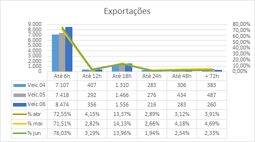 A situação é similar na exportação, que teve um aumento de aproximadamente 14% na quantidade de movimentação, além de um 3,5% a mais em liberações em até 6h, levando o tempo média de permanência nesta faixa para 2.06h.