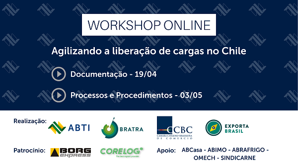 A ABTI, a Câmara Chileno-Brasileña de Comércio Exterior e o Programa Exporta Brasil, realizarão, respectivamente, nos dias 19 de abril e 03 de maio, o Workshop agilizando a liberação de cargas no Chile. O Workshop será dividido em duas etapas: o primeiro encontro (19/04 – às 17h) abordará sobre documentação, e o segundo (03/05 – às 17h) sobre processos e procedimentos. O evento integra a proposta da Associação de apresentar aos seus associados conteúdos relevantes para o desenvolvimento do transporte rodoviário internacional de cargas.