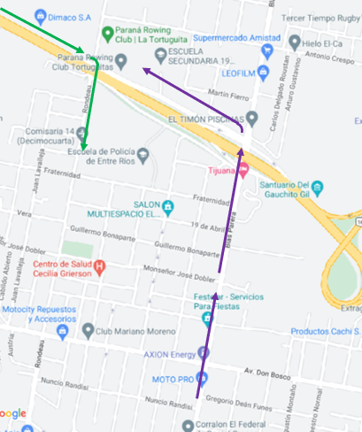 • A seta roxa indica a rota de caminhões que vão para Santa Fe, passando por Blas Parera em direção à Jose Hernandez, passam por baixo da ponte e pegam à esquerda;
