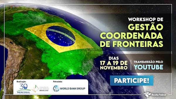 A Receita Federal, em parceria com o Banco Mundial, iniciou hoje um workshop para discussão de temas relacionados à Gestão Coordenada de Fronteiras, o evento acontecerá até sexta-feira, 19 de novembro. O Workshop está sendo transmitido pelo canal da Receita Federal no YouTube, nos idiomas português, espanhol e inglês.