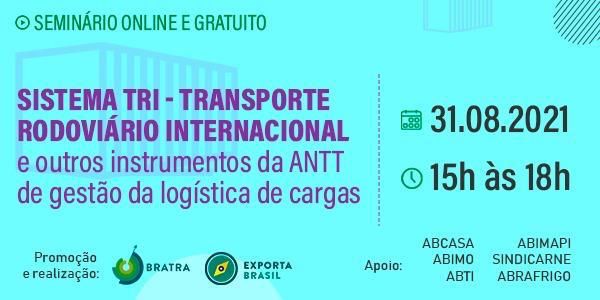 No próximo dia 31, das 15h às 18h, o Programa Exporta Brasil, promovido pelo Brazil Trade Development Center - BRATRA, realizará o Seminário "Sistema TRI - Transporte Rodoviário Internacional e outros instrumentos da ANTT de gestão da logística de cargas". O evento conta com o apoio institucional da ABTI e de entidades empresariais representativas de exportadores e importadores.