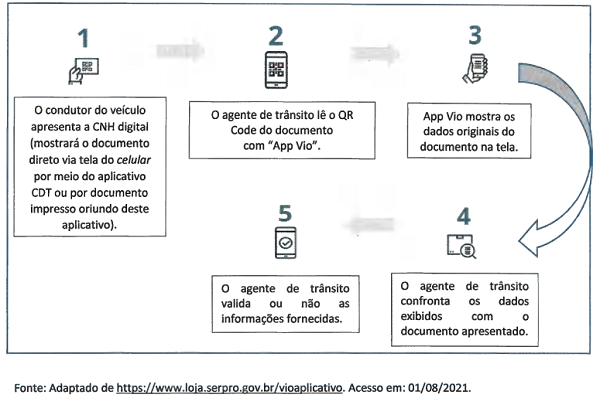 Em relação a validação de veracidade do documento, o aplicativo utilizado para esta função é o denominado "App Vio", disponível na Google Play e App Store. Por meio dele, é possível fazer a leitura do código QR e comprovar a autenticidade dos documentos digitais brasileiros (CNH digital e CRLV). Tal aplicativo é gratuito, funciona sem internet, fácil de baixar, configurar e utilizar e está disponível em vários idiomas, principalmente para o espanhol. O funcionamento do "App Vio" se dá pelo seguinte processo: