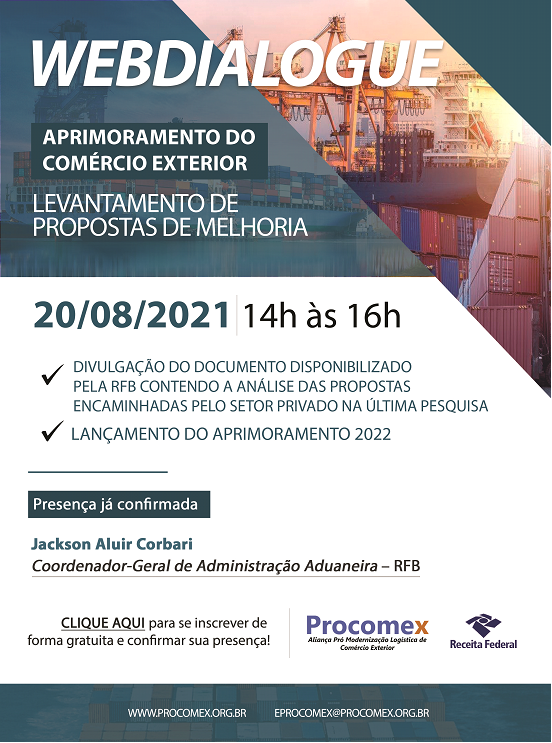 O Instituto Aliança Procomex realizará no próximo dia 20 de agosto, das 14h às 16h, o WebDialogue "Aprimoramento do Comércio Exterior – Levantamento de Propostas de Melhoria". O evento virtual é gratuito e contará com a participação do Coordenador-Geral de Administração Aduaneira da Receita Federal do Brasil, Jackson Aluir Corbari.