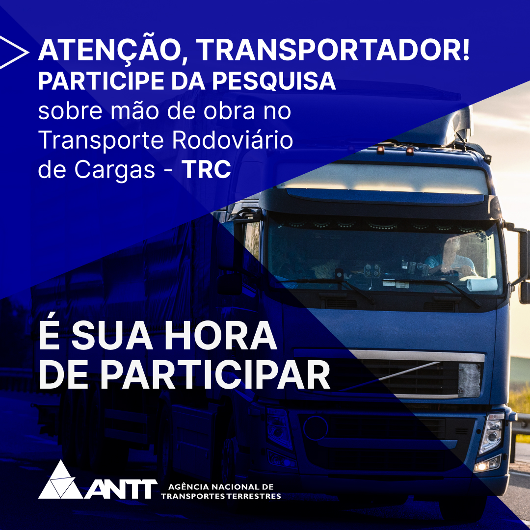A Agência Nacional de Transportes Terrestres (ANTT), por meio da Superintendência de Serviços de Transporte Rodoviário e Multimodal de Cargas (SUROC), está realizando uma pesquisa essencial para o Projeto “Diagnóstico acerca da escassez de mão de obra no Transporte Rodoviário de Cargas (TRC) e proposição de possíveis ações”, previsto no Plano de Gestão Anual – PGA 2025.