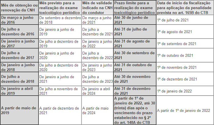 Conforme consta na normativa, para fins de aplicação da penalidade prevista no caput do art. 165-B do CTB, o prazo limite para a realização do exame toxicológico periódico será estabelecido de acordo com o mês da data de validade indicada na CNH do condutor, confira na imagem abaixo: