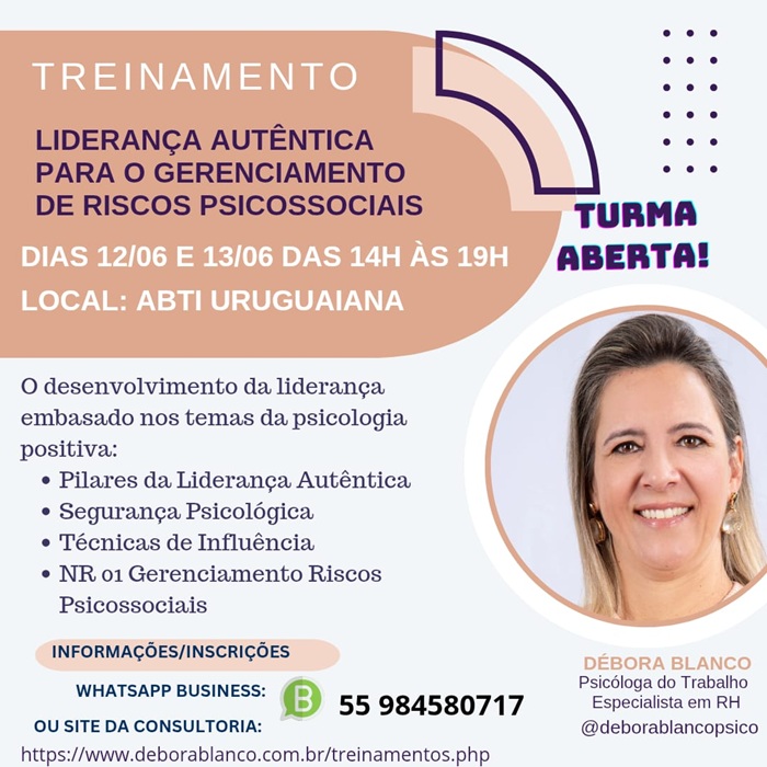 Nos dias 12 e 13 de junho, a ABTI recebe a psicóloga do trabalho Débora Blanco para o treinamento “A Prática da Liderança Autêntica no Gerenciamento de Riscos Psicossociais” – um curso presencial pensado para quem está na linha de frente com pessoas.