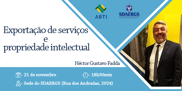 Será realizada no dia 21 de novembro (quinta-feira) às 18h30min, na sede do Sindicato dos Despachantes Aduaneiros do Estado do Rio Grande do Sul (SDAERGS), em Uruguaiana/RS, a palestra "Exportação de serviços e Propriedade Intelectual" que será ministrada por Héctor Gustavo Fadda. O palestrante é licenciado em Administração pela Universidade Nacional de Córdoba e possui mestrado em Relações Internacionais.