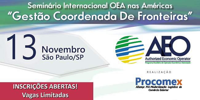 O Seminário Internacional OEA nas Américas: "Gestão Coordenada de Fronteiras" é organizado pela Aliança Procomex e será realizado no dia 13 de novembro, no Maksoud Plaza Hotel, em São Paulo. O evento tem como objetivo reunir órgãos de fronteira, para discutir e trabalhar sobre o Operador Econômico Autorizado (OEA) Regional Integrado.
