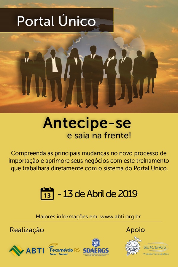 A Associação Brasileira de Transportadores Internacionais promoverá, juntamente com a Fecomércio e o SDAERGS, um treinamento relacionado ao Comércio Exterior. Este, tem como objetivos desmistificar a problemática de integração dos processos internos das empresas ao Novo Processo de Importação, além de compreender os conceitos internacionais de aduana moderna e os novos conceitos de negócio do Novo Processo de Importação.