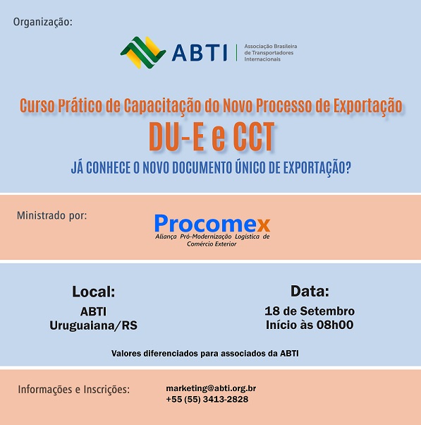 O treinamento prático do Novo Processo de Exportação (DU-E) é destinado a todos os operadores do Comércio Exterior. Será realizado no dia 18 de setembro no auditório da ABTI com início às 8h e com carga horária de 9 horas aula.