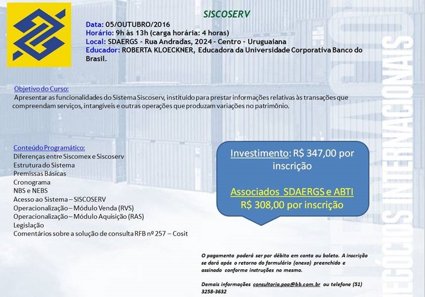 A Gerência Regional de apoio ao Comércio Exterior irá promover em Uruguaiana no dia 05 de outubro o treinamento SISCOSERV. Os Associados da ABTI e SDAERGS terão desconto conforme abaixo.