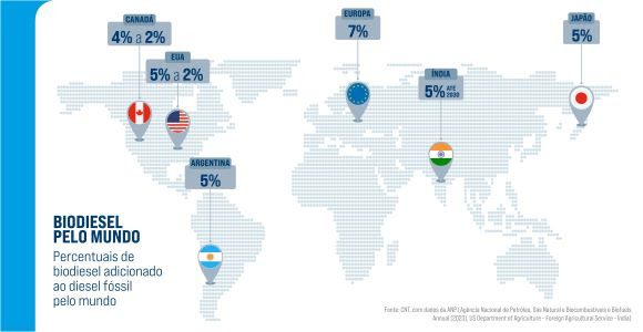 Em outros países do mundo, os percentuais de mistura de biodiesel têm ficado entre 2% e 7%. A União Europeia adota o B7 (7% de mistura), o Japão, a Argentina e a Índia o B5 (5% de mistura) e no Canadá e EUA os estados variam entre 2% e 5%.