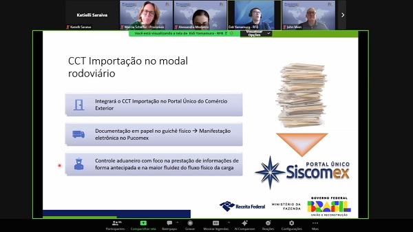 Aconteceu nesta segunda-feira (18), o Webdialogue, módulo CCT Importação - Modal Rodoviário, evento promovido pela Receita Federal e organizado pelo Instituto Procomex para apresentar e colher informações que impulsionem o trabalho de implantação do sistema de Controle de Carga e Trânsito (CCT) no modal rodoviário, dentro do Portal Único do Comércio Exterior (Siscomex).